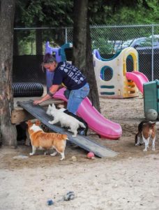 I started trying different things, instinctively drawing on techniques that worked with my children – naptimes, regular schedule, interrupting rowdy play, giving dogs attention, separating large and small dogs. We introduced toys to the groups, which was even a challenge as they argued over the multitude of tennis balls. We pulled those out and started with red Kong balls and slowly were able to reintroduce tennis balls and then other types of toys, quickly finding out which toys were considered high value and avoided them in the future.