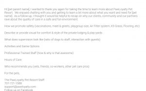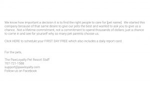 - Another email goes out a few days later: Remind them about an upcoming holiday and let them know you offer boarding and daycare services. Ask them to book a tour of your facility so you can show them around. Again, another sample from Pawloyalty (click the image to see the larger version).